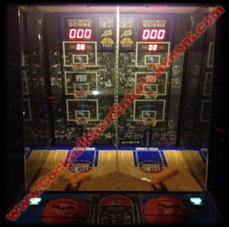 Head to head basketball action with ping pong size basketballs that are shot into 1 of 3 different baskets for different point values. Each player presses down on their Basketball Control Panel with varied force panel to shoot their mini-basketballs into 1 of 3 miniature nets in their court. If you shoot just right you can put your basketball through all 3 nets in one shot for Bonus points! Gameplay is timed so everyone gets a turn.  Dimensions: 6'H x 32"W x 3'L, 350 lbs.